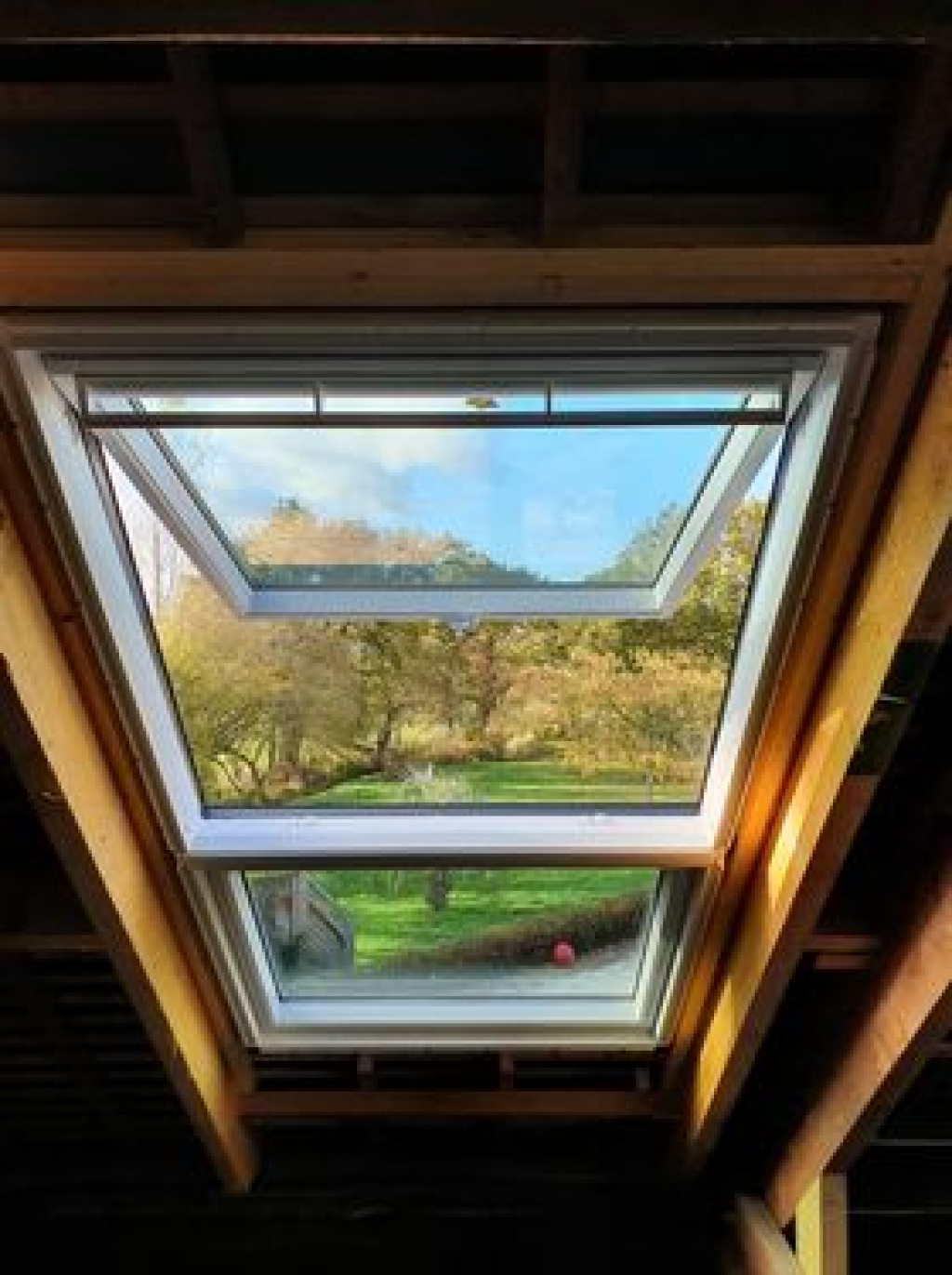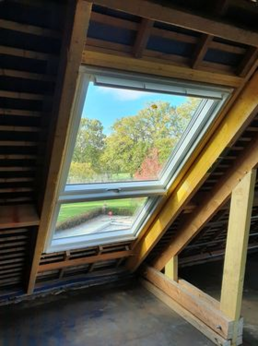Aménagement des combles d'une maison dans la campagne Rennaise avec pose de velux avec volets solaires