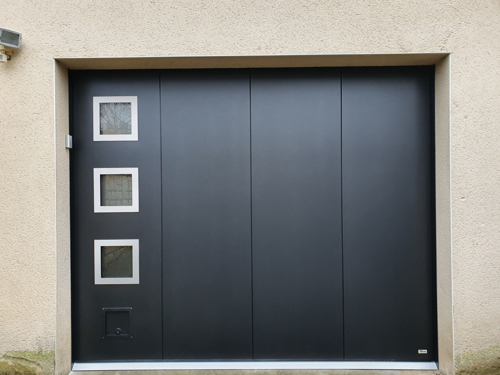 A Melesse, au nord de Rennes (35), installation d'une porte de garage France Fermeture de couleur noir 2100 sablé, hublots carrés avec encadrement en inox et trappe à chat. Manœuvre électrique, éclairage LED, télécommandes et digicode.