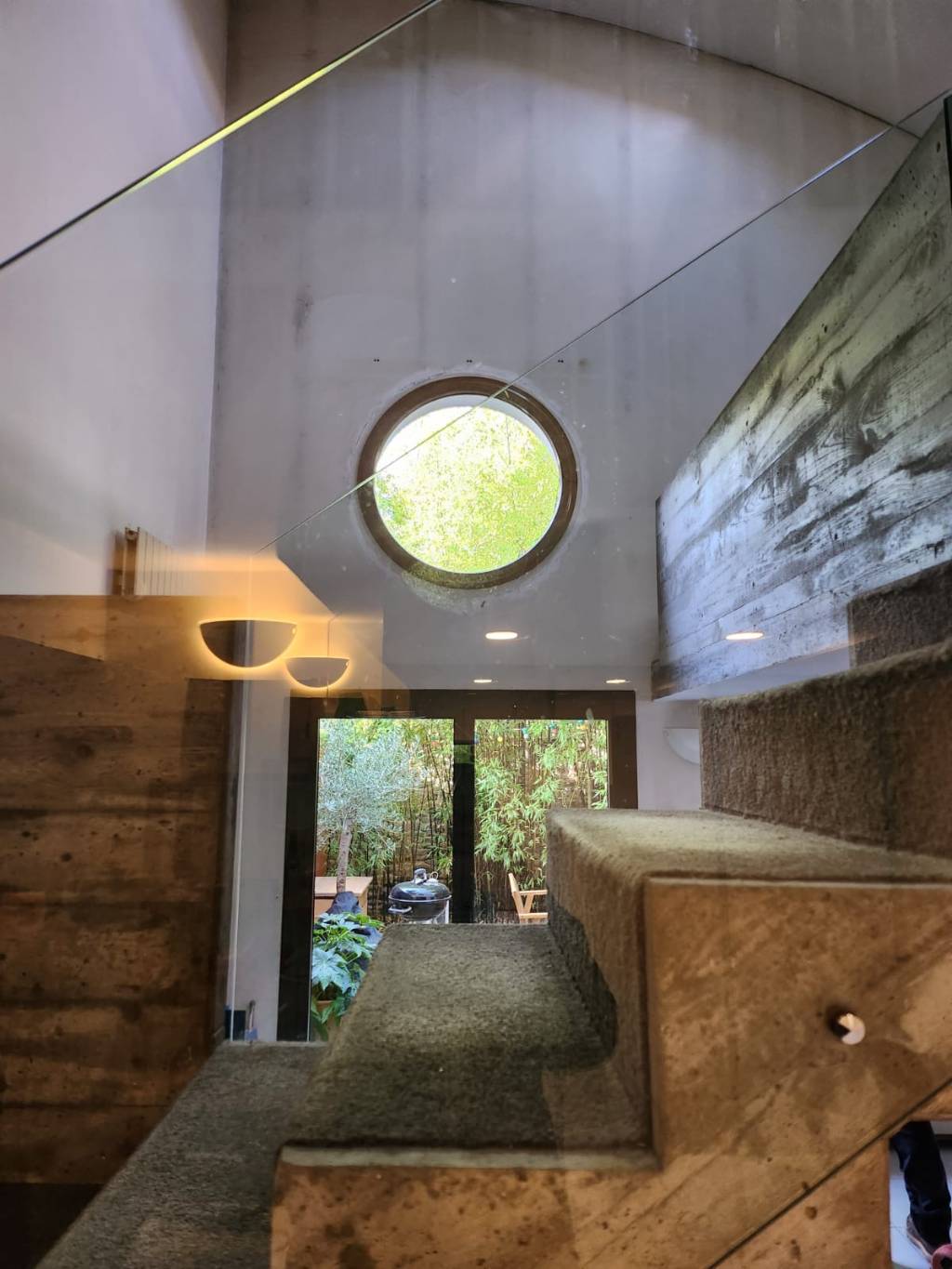 Porte d'entrée, baies coulissantes (aluminium K-LINE noir 2100 sablé) et œil de bœuf (PVC plaxé chêne américain SWAO).