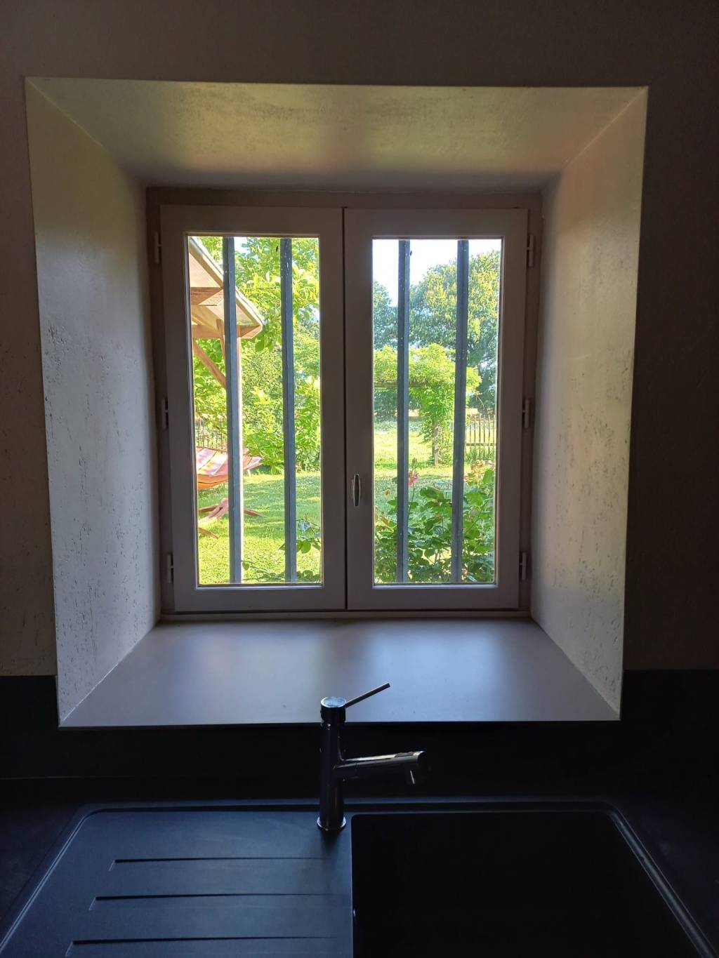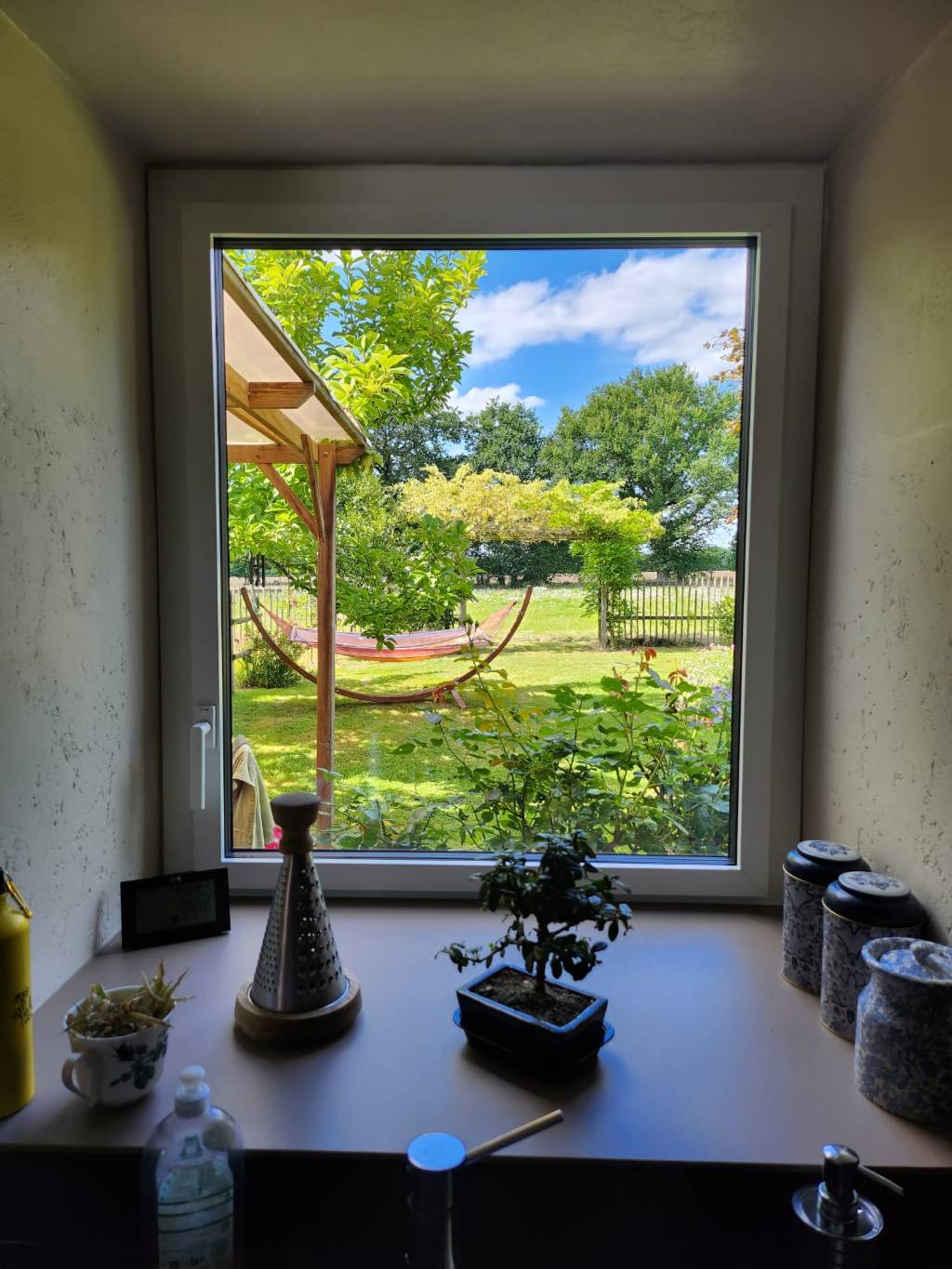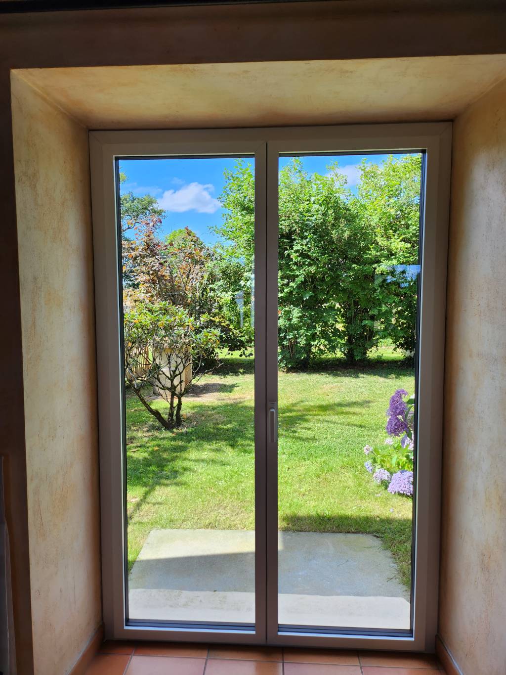 Sur cette longère de la campagne rennaise, à La Méziere, en Ille-et-Vilaine (35), exemple concret du gain en luminosité entre cette ancienne fenêtre bois 2 vantaux et l'aluminium à "ouvrant caché".